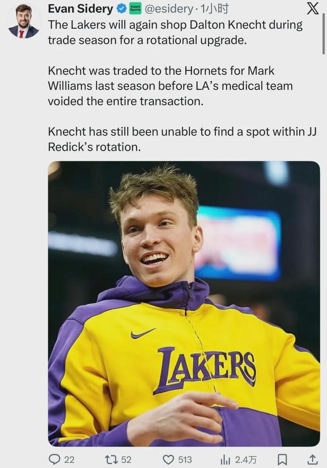 眼看着克内克特二年级的发挥不进反退,湖人再次有了兜售他的想法。