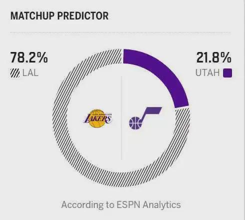 接下来湖人将在客场对阵爵士,ESPN预测紫金军团的胜率高达78.2%,这是一场不容有失的比赛。